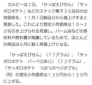 また記事からの抜粋なんですが『カルビー』さんのお菓子が値上げですって😅