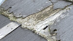 パミールは、薄い板を一枚ずつ重ね合わせ圧縮して水分を抜いていく抄造法(しょうぞうほう)という方法で製造されていました。そのため層間に剥離が発生しやすいのです。これはミルフィーユ現象とも呼ばれますが、表面から1枚ずつ剥がれてしまうことで屋根材の素地が露出してしまうのです。この製造方法の場合、表面の防水性が失われたりスレートの間の隙間から水が入った場合には重ねた層の間に毛細管現象で水が入っていくため、それぞれの層に剥がれが生じてきてミルフィーユのようにサクサクになってきます。実際に劣化が激しいパミールの現場で歩いてみるとサクサクとした感じが足に感じるくらいです。