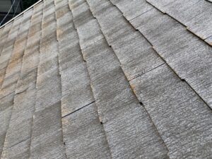 スレート屋根の劣化は、主に表面の塗膜の劣化です。だんだん色が白っぽくなります。そうなるとスレート自体が水を吸いやすくなり、その水分でスレート自体が反ってきたりします。そうすると水が直接下地に入りやすくなります。下地には防水シートが貼られているのですが、入る水が多くなってくると防水性能を上回ってきて雨漏りにつながってきます。またスレートの端には金属製のカバーをするのですが、その部分は下地に防水していない場合も多くこの部分が劣化したり台風などでへこんだりすると雨漏りの原因になりやすいので小まめな点検をした方が良いと思います。