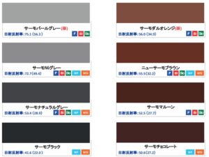 外壁でも反射率が色見によって違います。見本帳にない色を選択する場合は反射率がわかりませんので反射率を考えて選ぶ場合は見本帳にある色から選ぶことになるのが最大の注意点です。