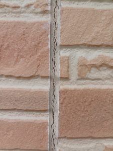 こういった部分の事で目地「めじ」と呼びます。ここには「コーキング」とか「シーリング」と呼ばれるものが基本的には新築の際に使用され、水が壁の内側に侵入しないようになっています。ですが年数が経ち紫外線を多く浴びてくると劣化し