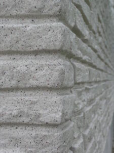 このような石材調塗料は中塗りに天然石や着色セラミックが使われているのですが、この天然石やセラミック部分の樹脂はアクリル系が使われていることがほとんどです。確かに可撓性(弾力性)を持たせる目的としては良いのですが、劣化も早い樹脂になります。通常は石材調塗料はその上からクリア塗料を塗布します。クリア塗料はシリコン系の樹脂なので一定の耐候性がありますし、中に劣化を早める顔料の酸化チタンが入っていないので顔料を含んだ一般的なシリコン塗料よりは持ちは良いのですが、問題はしっかりクリアが塗布できているかです。よく言われるように石材調塗料・セラミック塗料は実は持ちが悪いなどと言っている方もいらっしゃいますが、顔料を使っていないので色褪せに強くしっかり施工できれば確かに高い耐候性がある材料です。それより問題なのはしっかりとした工程とクリアの塗布量が守られているかという問題です。前回の塗装が石材調塗料のお宅を拝見したことがありますが、しっかり施工されていれば20年くらいでも綺麗に保てている場合もありますが、逆にクリアの塗布量が足りていない箇所があったり、過希釈(薄めすぎ)で塗布していたり、施工時に雨の影響を受けていたりすると10年たたずにボロボロになっているお宅を見ることもあります。そのため前回が石材調塗料だった場合は実際に壁を触ってみてクリアがまだどれだけ残っているかを確かめる必要があります。